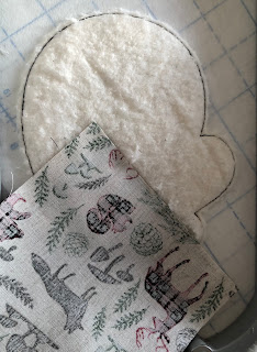 I hooped two layers of Wet N Melt and stitched the placement line for the batting and face fabric. I placed both layers as instructed and then did the tack-down stitch. Then I had to trim both layers. I found that I couldn't get as close as I wanted, it was too bulky. On the next two I did, I did one layer at a time, repeating the tack-down stitch. I was able to trim closer and I got a better finished edge.